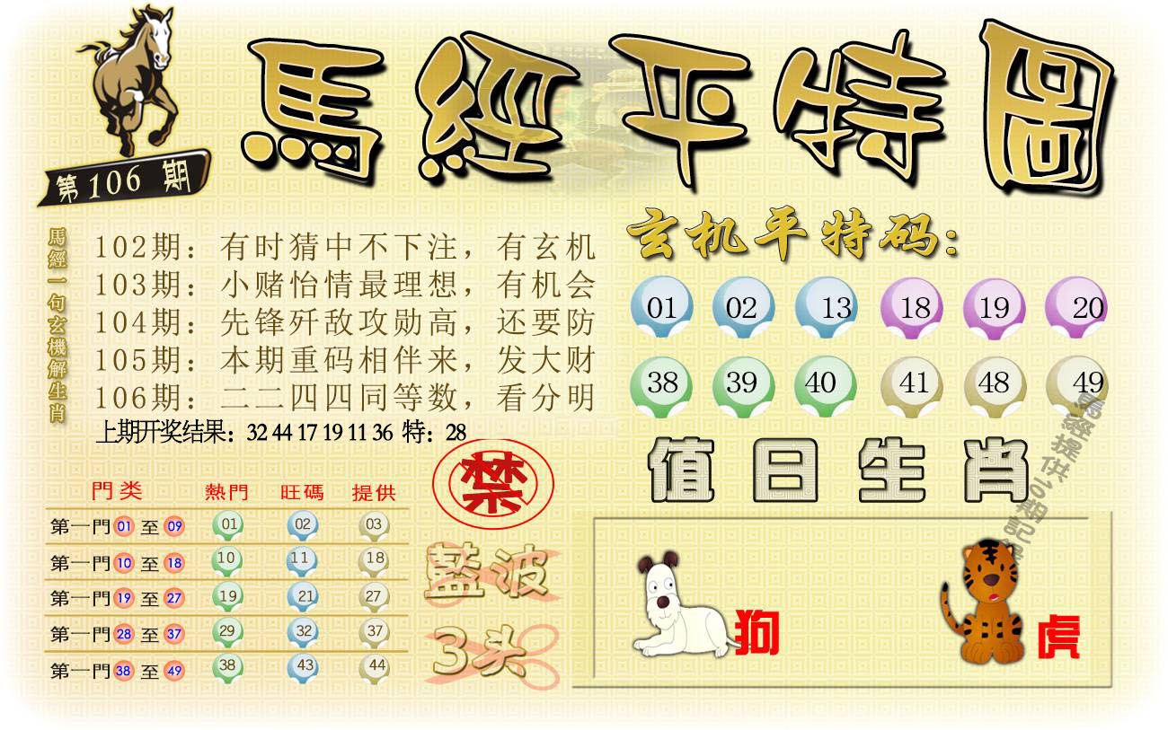 105期: ★平特3肖★ 【狗虎猪】 开2个准